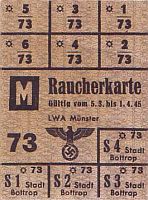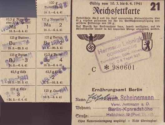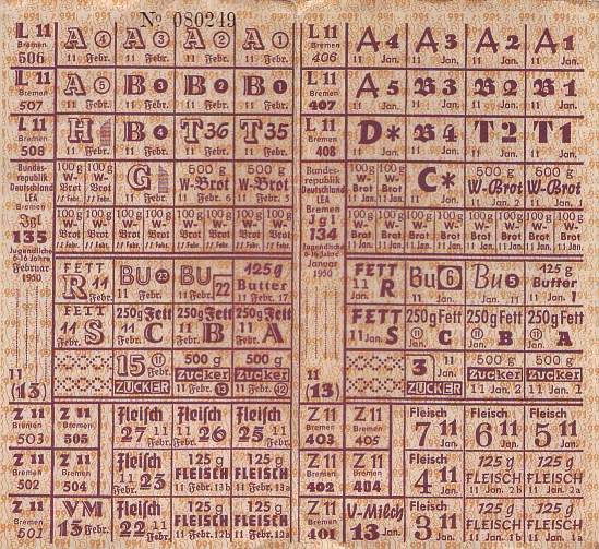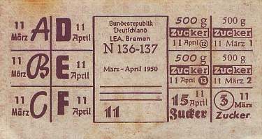 Noch bis 1950 gab es das Verteilungssystem über Lebensmittelkarten und Bezugsscheine in der Bundesrepublik (in der DDR gab es Lebensmittelkarten bis 1958, Kartoffel- und Kohlenkarten bis 1966) . Untenstehend eine Lebensmittelkarte der Bundesrepublik Deutschland für Jugendliche von 6-16 Jahren, Bremen, Januar 1950 und eine Lebensmittelkarte der Bundesrepublik Deutschland für Zucker, Bremen, März-April 1950.