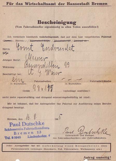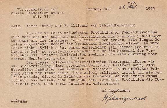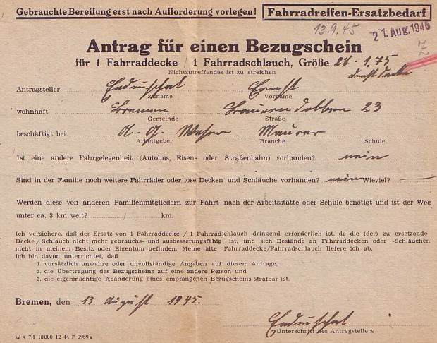 ![]() Mappeninnenseite (rotblau-karierte Mappe) mit Klappfächern für die verschiedenen Lebensmittelkarten. . Viele Waren bekam man in der Nachkriegszeit nur auf Antrag mit Bescheinigung über die besondere Dringlichkeit des Bedarfs (z.B. weil diese für die Ausübung des Berufes benötigt wurden). Aufgrund des enormen Mangels konnte jedoch vielen Antragsstellern die Ware nicht ausgeliefert werden wie auch das folgende Beispiel aus dem Herbst 1945 zeigt: Bescheinigung und Antrag auf einen Bezugsschein für Fahrradreifen-Ersatzbedarf und nachfolgendes Antwortschreiben mit der Ablehnung des Antrages.